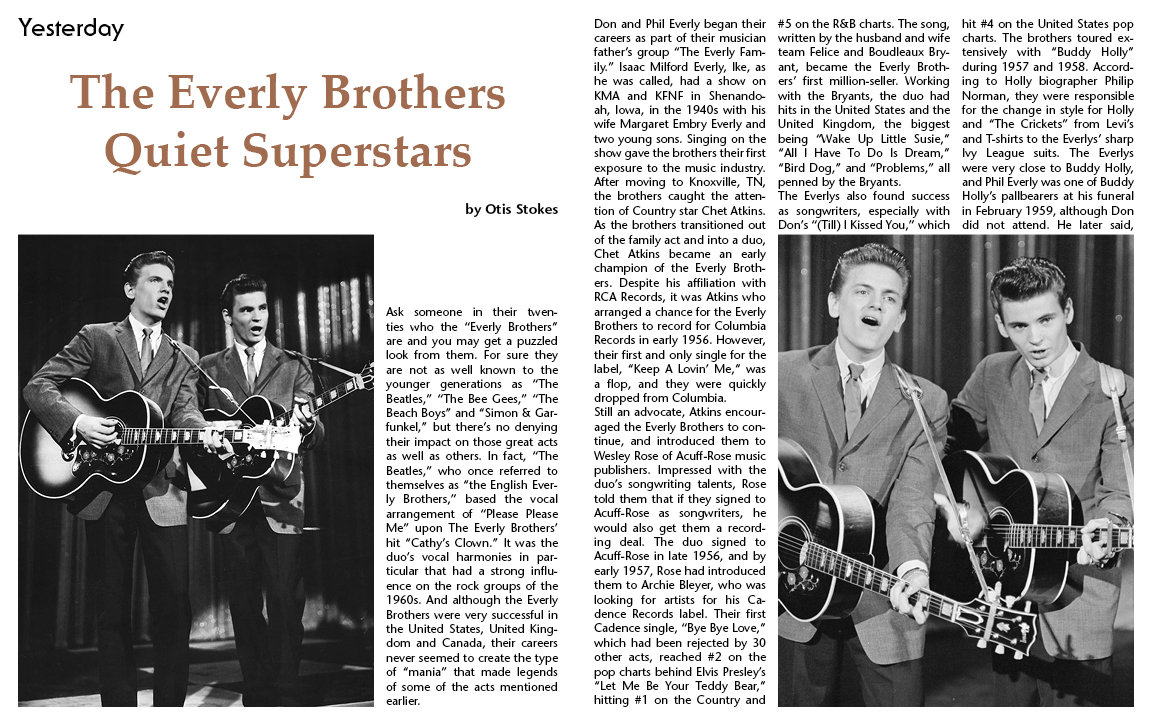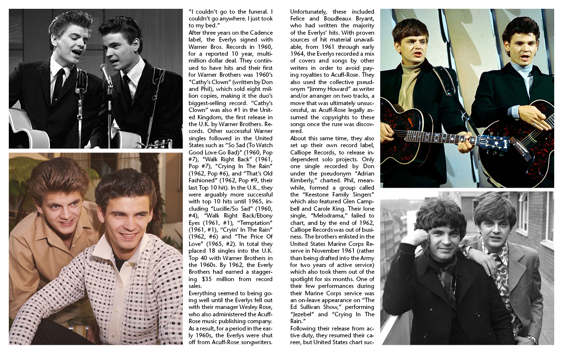 Ask someone in their twenties who the "Everly Brothers" are and you may get a puzzled look from them. For sure they are not as well known to the younger generations as "The Beatles," "The Bee Gees," "The Beach Boys" and "Simon & Garfunkel," but there's no denying their impact on those great acts as well as others. In fact, "The Beatles," who once referred to themselves as "the English Everly Brothers," based the vocal arrangement of "Please Please Me" upon The Everly Brothers' hit, "Cathy's Clown." It was the duo's vocal harmonies in particular that had a strong influence on the rock groups of the 1960s. And although the Everly Brothers were very successful in the United States, United Kingdom and Canada, their careers never seemed to create the type of "mania" that made legends of some of the acts mentioned earlier. Don and Phil Everly began their careers as part of their musician father's group "The Everly Family." Isaac Milford Everly, Ike — as he was called — had a show on KMA and KFNF in Shenandoah, Iowa, in the 1940s with his wife Margaret Embry Everly and two young sons. Singing on the show gave the brothers their first exposure to the music industry. After moving to Knoxville, TN, the brothers caught the attention of Country star "Chet Atkins." As the brothers transitioned out of the family act and into a duo, Chet Atkins became an early champion of the Everly Brothers. Despite his affiliation with RCA Records, it was Atkins who arranged a chance for the Everly Brothers to record for Columbia Records in early 1956. However, their first and only single for the label, "Keep A Lovin' Me," was a flop, and they were quickly dropped from Columbia. Still an advocate, Atkins encouraged the Everly Brothers to continue, and introduced them to Wesley Rose of Acuff-Rose music publishers. Impressed with the duo's songwriting talents, Rose told them that if they signed to Acuff-Rose as songwriters, he would also get them a recording deal. The duo signed to Acuff-Rose in late 1956, and by early 1957, Rose had introduced them to Archie Bleyer, who was looking for artists for his Cadence Records label. Their first Cadence single, "Bye Bye Love," which had been rejected by 30 other acts, reached No. 2 on the pop charts behind Elvis Presley's "Let Me Be Your Teddy Bear," hitting No. 1 on the Country and No. 5 on the R&B charts. The song, written by the husband and wife team Felice and Boudleaux Bryant, became the Everly Brothers' first million-seller. Working with the Bryants, the duo had hits in the United States and the United Kingdom, the biggest being "Wake Up Little Susie," "All I Have To Do Is Dream," "Bird Dog," and "Problems," all penned by the Bryants. The Everlys also found success as songwriters, especially with Don's "(Till) I Kissed You," which hit No. 4 on the United States Pop charts. The brothers toured extensively with "Buddy Holly" during 1957 and 1958. According to Holly biographer Philip Norman, they were responsible for the change in style for Holly and "The Crickets" from Levi's and T-shirts to the Everlys' sharp Ivy League suits. The Everlys were very close to Buddy Holly, and Phil Everly was one of Buddy Holly's pallbearers at his funeral in February 1959, although Don did not attend. He later said, "I couldn't go to the funeral. I couldn't go anywhere. I just took to my bed." After three years on the Cadence label, the Everlys signed with Warner Bros. Records in 1960, for a reported 10-year, multi-million-dollar deal. They continued to have hits and their first for Warner Brothers was, 1960's "Cathy's Clown" (written by Don and Phil), which sold eight million copies, making it the duo's biggest-selling record. "Cathy's Clown" was also number 1 in the United Kingdom, the first release in the U.K. by Warner Brothers. Records. Other successful Warner singles followed in the United States, such as "So Sad (To Watch Good Love Go Bad)" (1960, Pop No. 7), "Walk Right Back" (1961, Pop No. 7), "Crying In The Rain" (1962, Pop No. 6), and "That's Old Fashioned" (1962, Pop No. 9, their last Top 10 hit). In the U.K., they were arguably more successful with top-10 hits until 1965, including "Lucille/So Sad" (1960, No. 4), "Walk Right Back/Ebony Eyes (1961, No. 1), "Temptation" (1961, No. 1), "Cryin' In The Rain" (1962, No. 6) and "The Price Of Love" (1965, No. 2). In total they placed 18 singles into the U.K. Top 40 with Warner Brothers in the 1960s. By 1962, the Everly Brothers had earned a staggering $35 million from record sales. Everything seemed to being going well, until the Everlys fell out with their manager Wesley Rose, who also administered the Acuff-Rose music publishing company. As a result, for a period in the early 1960s, the Everlys were shut off from Acuff-Rose songwriters. Unfortunately, these included Felice and Boudleaux Bryant, who had written the majority of the Everlys' hits. With proven sources of hit material unavailable, from 1961 through early 1964, the Everlys recorded a mix of covers and songs by other writers in order to avoid paying royalties to Acuff-Rose. They also used the collective pseudonym "Jimmy Howard" as writer and/or arranger on two tracks, a move that was ultimately unsuccessful, as Acuff-Rose legally assumed the copyrights to these songs once the ruse was discovered. About this same time, they also set up their own record label, Calliope Records, to release independent solo projects. Only one single recorded by Don under the pseudonym "Adrian Kimberly," charted. Phil, meanwhile formed a group called the "Keestone Family Singers" which also featured "Glen Campbell" and "Carole King." Their lone single, "Melodrama," failed to chart, and by the end of 1962, Calliope Records was out of business. The brothers enlisted in the United States Marine Corps Reserve in November 1961 (rather than being drafted into the Army for two years of active service) which also took them out of the spotlight for six months. One of their few performances during thei