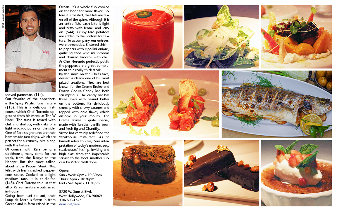 Just as Victor’s clients have remained loyal to all of his establishments over the years, so have the people who work with him. Rare’s manager, Shantel Zorrilla, has been on Drai’s team since Botero in Las Vegas. She greeted us as we arrived and was attentive during our entire meal. Chef Patrick Florendo’s culinary talents have also attributed to Rare by Drai’s success. We were already admirers of his cuisine and were looking forward to seeing how he had married the old with the new from the menu at Drai’s Hollywood. Chef Florendo is an Australian native who has worked in award-winning kitchens, from San Francisco to New York City. He eventually took on the pastry world at Tableau in Las Vegas before becoming the pastry chef at Victor and Steve Wynn’s steakhouse, Botero. He has been working with Victor ever since, moving to Los Angeles to head up Drai’s Hollywood at the W Hotel and now Rare.