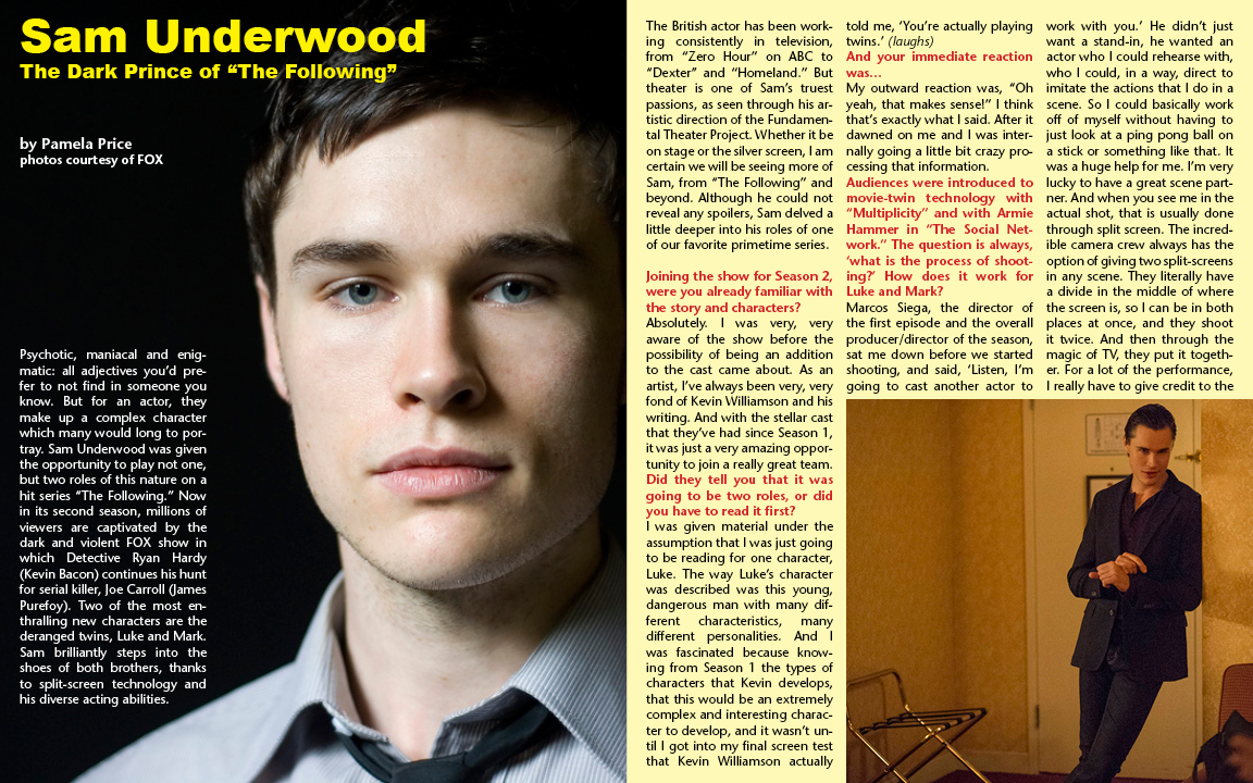 Psychotic, maniacal and enigmatic: all adjectives you’d prefer to not find in someone you know. But for an actor, they make up a complex character which many would long to portray. Sam Underwood was given the opportunity to play not one, but two roles of this nature on a hit series “The Following.” Now in its second season, millions of viewers are captivated by the dark and violent FOX show in which Detective Ryan Hardy (Kevin Bacon) continues his hunt for serial killer, Joe Carroll (James Purefoy). Two of the most enthralling new characters are the deranged twins, Luke and Mark. Sam brilliantly steps into the shoes of both brothers, thanks to split-screen technology and his diverse acting abilities. The British actor has been working consistently in television, from “Zero Hour” on ABC to “Dexter” and “Homeland.” But theater is one of Sam’s truest passions, as seen through his artistic direction of the Fundamental Theater Project. Whether it be on stage or the silver screen, I am certain we will be seeing more of Sam, from “The Following” and beyond. Although he could not reveal any spoilers, Sam delved a little deeper into his roles of one of our favorite primetime series.