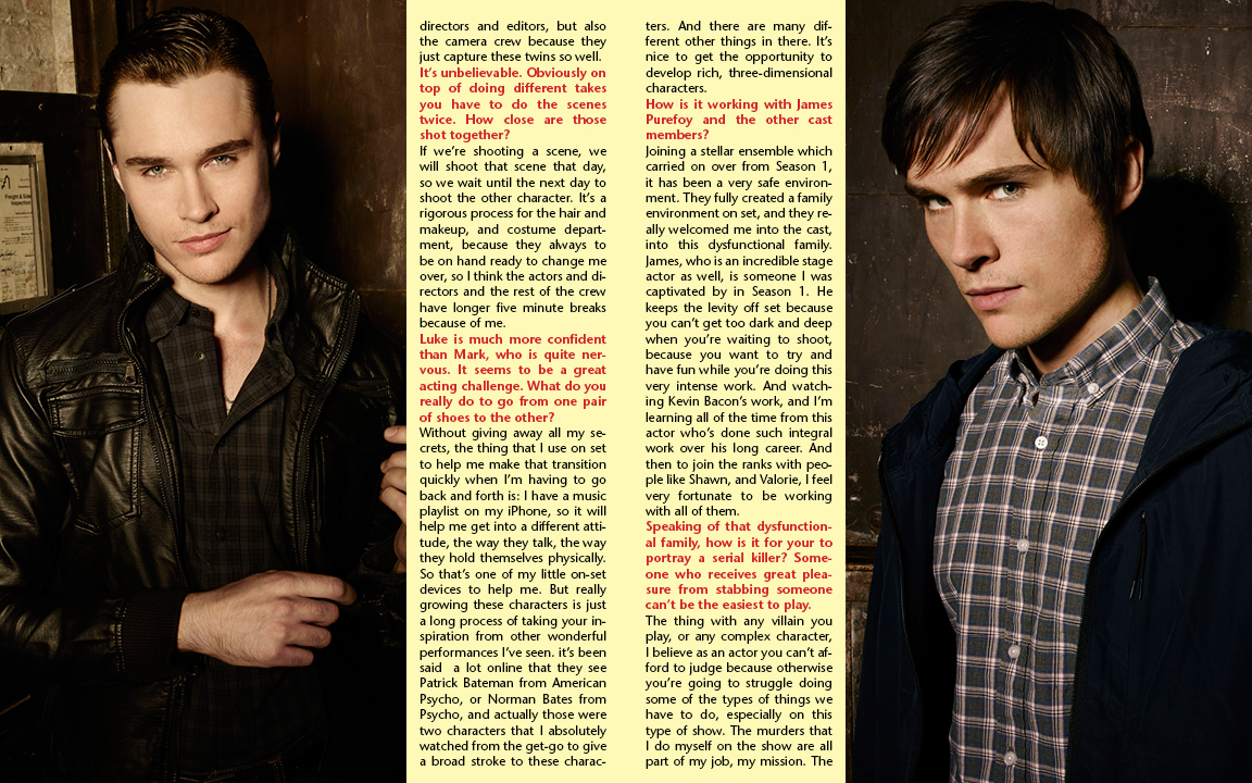 I was given material under the assumption that I was just going to be reading for one character—Luke. The way Luke’s character was described was this young, dangerous man with many different characteristics, many different personalities. And I was fascinated because knowing from season 1 the types of characters that Kevin develops, that this would be an extremely complex and interesting character to develop, and it wasn’t until I got into my final screen test that Kevin Williamson actually told me, ‘You’re actually playing twins.’