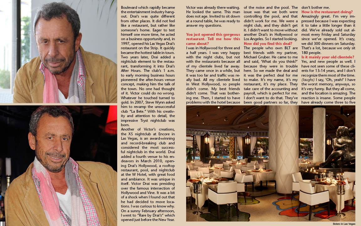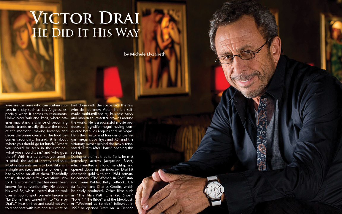 Victor Drai by Michele Elyzabeth Rare are the ones who can sustain success in a city such as Los Angeles, especially when it comes to restaurants. Unlike New York and Paris “where eateries may stand a chance of becoming iconic” trends usually dictate the mood of the moment, making location and decor the prime concern. The food becomes secondary. Instead, it is about ‘where you should go for lunch,’ ‘where you should be seen in the evening,’ ‘what you should wear,’ and ‘who goes there?’ With trends comes yet another pitfall, the lack of identity and soul. Most restaurants seem to look alike as if a single architect and interior designer had worked on all of them. Thankfully for us, there are a few exceptions. Victor Drai is one man that has never been known for conventionality. He does it his way! So, when I heard that he took over an iconic spot formerly known as “Le Dome” and turned it into “Rare by Drai’s,” I was thrilled and could not wait to reconnect with him and see what he had done with the space. For the few who do not know Victor, he is a self-made multi-millionaire, business savvy and known to jet-setter crowds around the world. He is a successful movie producer, a nightlife mogul having conquered both Los Angeles and Las Vegas. He is the creator and founder of Las Vegas’ mega clubs Tryst and XS, and the visionary owner behind the newly renovated “Drai’s After Hours” opening this spring. ME: You just opened this gorgeous restaurant; tell me how this came about? I was in Hollywood for three and a half years. I was very happy with the night clubs, but not with the restaurants because all of my clientele lived far away. They came once in a while, but it was too far and traffic was really bad. All my clientele lived in West Hollywood, so people didn’t come. My best friends didn’t come. That was bothering me. Then, I started to have problems with the hotel because of the noise and the pool. The issue was that we both were controlling the pool, and that didn’t work for me. We were a night club, and they didn’t get it. I didn’t want to move without another Drai’s in Hollywood or Los Angeles. So I started looking. How did you find this deal? The people who own BLT are best friends with my partner, Michael Gruber. He came to me, and said, ‘What do you think?’ because they were in trouble here. So we made the deal and it was the perfect deal for me to make. It’s my name, it’s my restaurant, it’s my place. They take care of the accounting and payroll, which is perfect for me. I don’t want to do that. They’ve been good partners so far; they don’t bother me. How is the restaurant doing? Amazingly great. I’m very impressed because I was expecting it to take a little longer than it did. We’ve already sold out almost every Friday and Saturday since we’ve opened. It’s crazy; we did 300 dinners on Saturday. That’s a lot, because we only sit 180 people. Is it mainly your old clientele? What do you still attribute to the fact that you’ve been able to survive? Are you just a lucky guy? Or do you just understand business? Yes, the latter. I’ve always had that in my life. I was in fashion in France and I was in the movie business. I’ve always been very successful in what I do. But you have a little bit of luck on your side, though, don’t you? Yeah, you have to. I’m lucky to be healthy! (laughs) It’s true, in that sense. But I know what I want to do, and I’m very opinionated and I’m very sure of myself. I’m not, but I always look like I’m very sure of myself, and I like to do new things. And I like beautiful places. Did you decorate this space? Everything — I decorate all of my places. The Drais’, the night clubs, XS — all of them. That’s the most fun of it. The new club is insane. Are you still involved in producing? No. Why? You were successful at it. Yes, but if I were a writer or a director, I would definitely still be doing it. But the producer is like the first guy who creates the project, and then you’re the last piece in the wheel. Soon the director comes in, and you’re out, basically. They are the guys who decide what to do and how to do it, and I don’t like that. Then you have the studio. There are too many bosses for me and I don’t like that. I enjoyed it because it was something new. The chance to really make it in the film business as a French person was like a joke, so that was a challenge. That was fun. But there are lots of people in Hollywood who have been really nice to me. I have really good friends in Hollywood. They held the door open for me. Yes, because in LA I have my family, and in Vegas I have my work. It’s very easy; they’re 45 minutes apart. It was an expense that I’m really happy I did it, because that made it easier. Sometimes I wake up and I don’t know if I’m in LA or in Vegas. I can go for a day sometimes. What’s in the future for you after your reopening mid-May? We’ll reopen ‘After Hours’ in the same building, and then I have another club I’m opening in Bally’s. I moved ‘After Hours’ to Bally’s while the hotel was being renovated. Now that I’m moving it back to its original place, I’m going to use that space for a new club for the gay community. There’s no classy gay club on the strip in Vegas. As far as entertainment is concerned, is it strictly DJ? It’s all DJ music. What’s happened in the last few years in the night clubs is that DJs have become big, big stars. I would get a DJ, but to pay $400,000 a night is ridiculous. It makes no sense. Are you leasing, or are you the part-owner with the Hotel. I’m 50/50 partners with Caesar’s. How did you crack Vegas? First I started Drai’s in a place where it was a McDonald’s and in the worst hotel ever —an ugly and smelly hotel called The Barbary Coast. However, it was the best location on the strip. It was across from Caesars and Bally’s. The location was so insane,