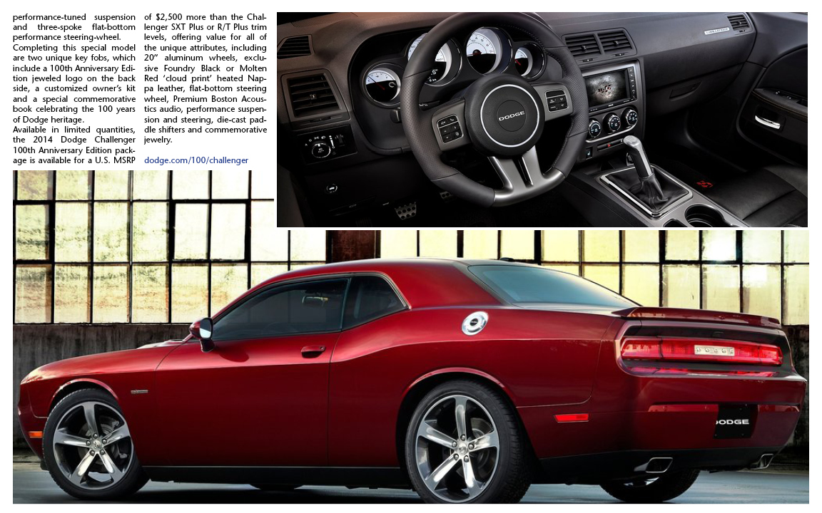 Available in limited quantities, the 2014 Dodge Challenger 100th Anniversary Edition package is available for a U.S. MSRP of $2,500 more than the Challenger SXT Plus or R/T Plus trim levels, offering value for all of the unique attributes, including 20” aluminum wheels, exclusive Foundry Black or Molten Red ‘cloud print’ heated Nappa leather, flat-bottom steering wheel, Premium Boston Acoustics audio, performance suspension and steering, die-cast paddle shifters and commemorative jewelry.