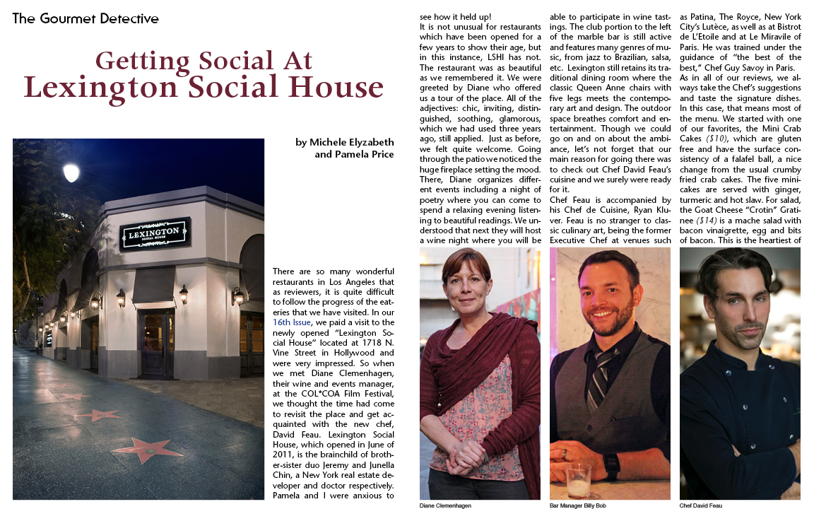 There are so many wonderful restaurants in Los Angeles that as reviewers, it is quite difficult to follow the progress of the eateries that we have visited. In our 16th Issue, we paid a visit to the newly opened “Lexington Social House” located at 1718 N. Vine Street in Hollywood and were very impressed. So when we met Diane Clemenhagen, their wine and events manager, at the COL*COA Film Festival, we thought the time had come to revisit the place and get acquainted with the new chef, David Feau. Lexington Social House, which opened in June of 2011, is the brainchild of brother-sister duo Jeremy and Junella Chin, a New York real estate developer and doctor respectively. Pamela and I were anxious to see how it held up!