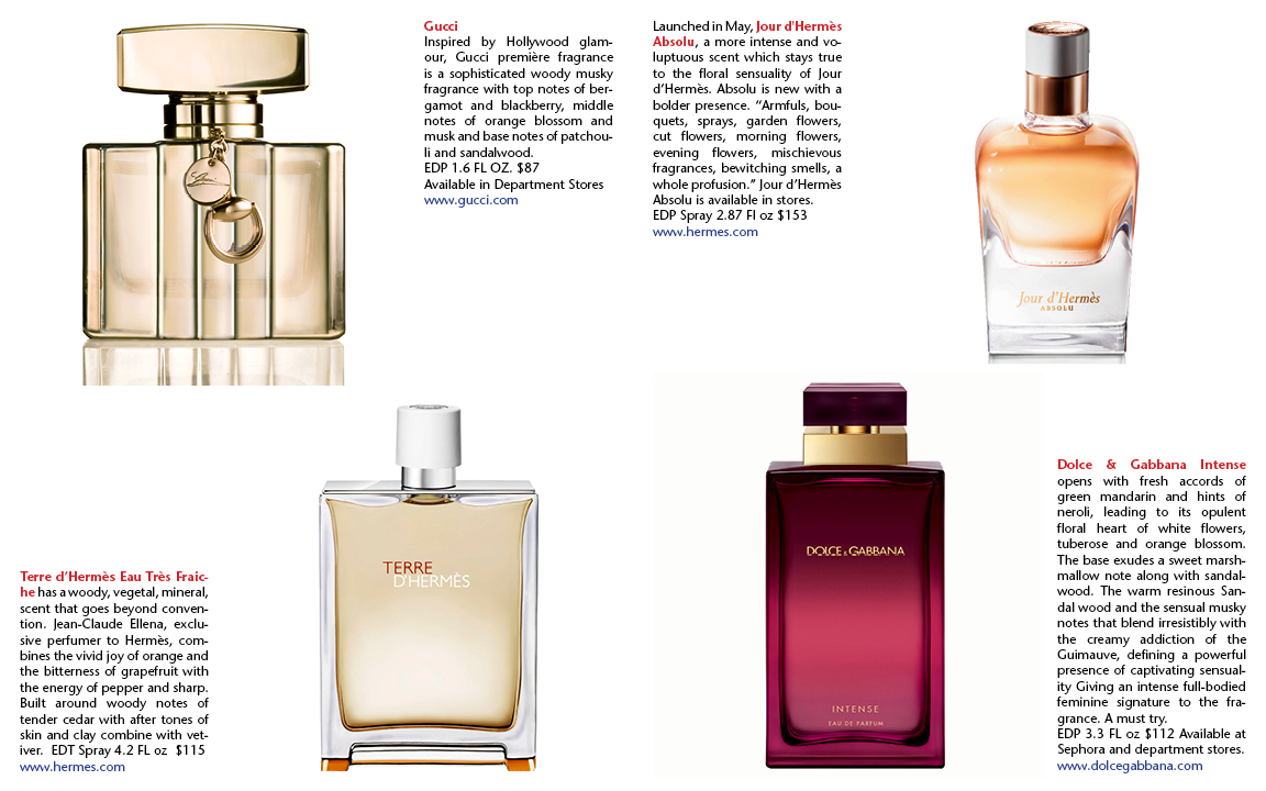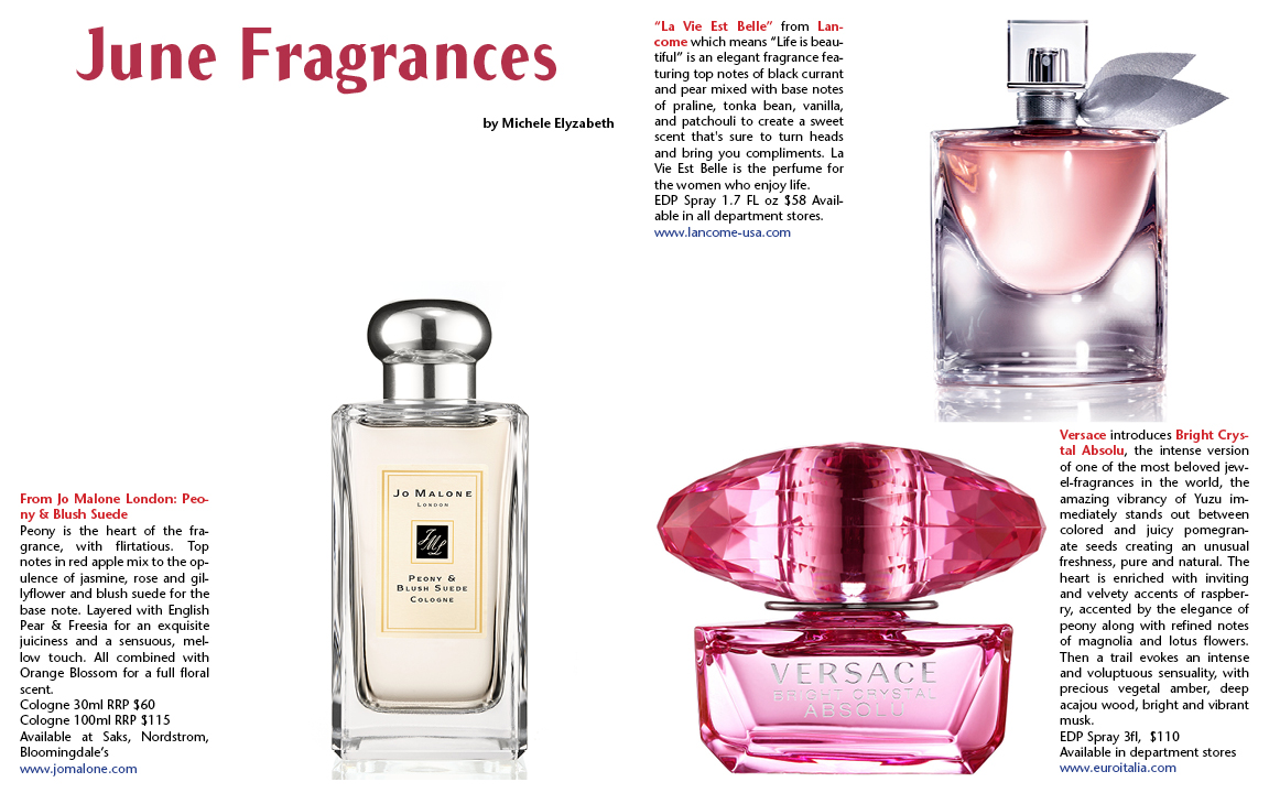 June Fragrances by Michele Elyzabeth From Jo Malone London: Peony & Blush Suede “La Vie Est Belle” from Lancome which means “Life is beautiful” is an elegant fragrance featuring top notes of black currant and pear mixed with base notes of praline, tonka bean, vanilla, and patchouli to create a sweet scent that's sure to turn heads and bring you compliments. La Vie Est Belle is the perfume for the women who enjoy life. Versace introduces Bright Crystal Absolu, the intense version of one of the most beloved jewel-fragrances in the world, the amazing vibrancy of Yuzu immediately stands out between colored and juicy pomegranate seeds creating an unusual freshness, pure and natural. The heart is enriched with inviting and velvety accents of raspberry, accented by the elegance of peony along with refined notes of magnolia and lotus flowers. Then a trail evokes an intense and voluptuous sensuality, with precious vegetal amber, deep acajou wood, bright and vibrant musk. Gucci Launched in May, Jour d'Hermès Absolu, a more intense and voluptuous scent which stays true to the floral sensuality of Jour d’Hermès. Absolu is new with a bolder presence. “Armfuls, bouquets, sprays, garden flowers, cut flowers, morning flowers, evening flowers, mischievous fragrances, bewitching smells, a whole profusion.” Jour d’Hermès Absolu is available in stores. Terre d’Hermès Eau Très Fraiche has a woody, vegetal, mineral, scent that goes beyond convention. Jean-Claude Ellena, exclusive perfumer to Hermès, combines the vivid joy of orange and the bitterness of grapefruit with the energy of pepper and sharp. Built around woody notes of tender cedar with after tones of skin and clay combine with vetiver. EDT Spray 4.2 FL oz $115 Dolce & Gabbana Intense opens with fresh accords of green mandarin and hints of neroli, leading to its opulent floral heart of white flowers, tuberose and orange blossom. The base exudes a sweet marshmallow note along with sandalwood. The warm resinous Sandal wood and the sensual musky notes that blend irresistibly with the creamy addiction of the Guimauve, defining a powerful presence of captivating sensuality Giving an intense full-bodied feminine signature to the fragrance. A must try. Lacoste L12.12 Neon Limited Edition New from John Varvatos Acqua Di Parma Blu Mediterraneo 150ml EDT For men: Light Blue Discover Volcano from Dolce & Gabbana is surprisingly colored with the liveliness of Sicilian citron, the happiness of Granny Smith apple, and the spontaneity of bluebells. Feminine and resolute notes are expressed with the intensity of jasmine, the freshness of bamboo, and the charm of white rose. The deep and true base embodies the character of cedarwood, the fullness of amber, and the embrace of musk. Dior Homme Eau de Toilette Spray is a Woody Floral Musk fragrance for men. Top notes are lavender, sage and bergamot; middle notes are iris, amber and cacao; base notes are vetiver, patchouli and leather. Tom Ford Noir |