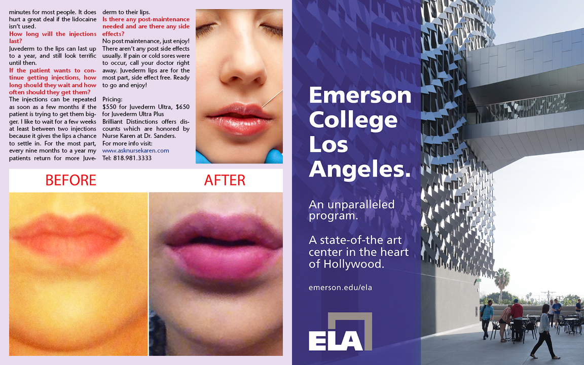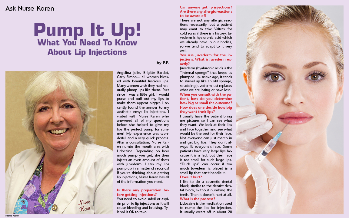 Ask Nurse Karen Pump It Up! by P.P. Angelina Jolie, Brigitte Bardot, Carly Simon… all women blessed with beautiful luscious lips. Many women wish they had naturally plump lips like them. Ever since I was a little girl, I would purse and puff out my lips to make them appear bigger. I recently found the answer to my aesthetic envy: lip injections. I visited with Nurse Karen who answered all of my questions before she helped to give my lips the perfect pump for summer! My experience was wonderful and a very quick process. After a consultation, Nurse Karen numbs the mouth area with Lidocaine. Depending on how much pump you get, she then injects an even amount of shots with Juvederm. I saw my lips pump up in a matter of seconds! Is there any preparation before getting injections? You need to avoid Advil or aspirin prior to lip injections as it will cause bleeding and bruising. Tylenol is OK to take. Can anyone get lip injections? Are there any allergic reactions to be aware of? There are not any allergic reactions necessarily, but a patient may want to take Valtrex for cold sores if there is a history. Juvederm is hyaluronic acid which we already have in our bodies, so we tend to adapt to it very well. You use Juvederm for the injections, what is Juvederm exactly? Juvederm (hyaluronic acid) is the “internal sponge” that keeps us plumped up. As we age, it tends to shrivel up like an old sponge, so adding Juvederm just replaces what we are losing or have lost. When you consult with the patient, how do you determine how big or small the outcome? How does one decide how big they want their lips? I usually have the patient bring me pictures so I can see what they want. We look at their lips and face together and see what would be the best for their face. Not everyone can just march in and get big lips. They don’t always fit everyone’s face. Some patients have very large lips because it is a fad, but there face is too small for such large lips. “Duck lips” can occur if too much Juvederm is placed in a small lip that can’t handle it. Does it hurt? I like to do a cosmetic dental block, similar to the dentist dental block, without numbing the teeth. Then it doesn’t hurt at all. Lidocaine is the medication used to numb the lips for injection. It usually wears off in about 20 minutes for most people. It does hurt a great deal if the lidocaine isn’t used. How long will the injections last? If the patient wants to continue getting injections, how long should they wait and how often should they get them? The injections can be repeated as soon as a few months if the patient is trying to get them bigger. I like to wait for a few weeks at least between two injections because it gives the lips a chance to settle in. For the most part, every 9 months to a year my patients return for more Juvederm to their lips. Is there any post-maintenance needed and are there any side effects? No post maintenance, just enjoy! There aren’t any post side effects usually. If pain or cold sores were to occur, call your doctor right away. Juvederm lips are for the most part, side effect free. Ready to go and enjoy! Pricing: |