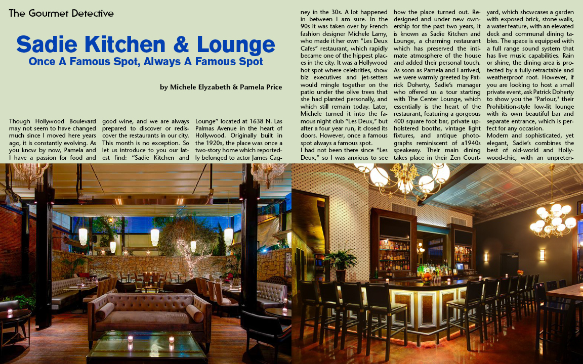 Though Hollywood Boulevard may not seem to have changed much since I moved here years ago, it is constantly evolving. As you know by now, Pamela and I have a passion for food and good wine, and we are always prepared to discover or rediscover the restaurants in our city. This month is no exception. So let us introduce to you our latest find: “Sadie Kitchen and Lounge” located at 1638 N. Las Palmas Avenue in the heart of Hollywood. Originally built in the 1920s, the place was once a two-story home which reportedly belonged to actor James Cagney in the 30s. A lot happened in between I am sure. In the 90s it was taken over by French fashion designer Michele Lamy, who made it her own “Les Deux Cafes” restaurant, which rapidly became one of the hippest places in the city. It was a Hollywood hot spot where celebrities, show biz executives and jet-setters would mingle together on the patio under the olive trees that she had planted personally, and which still remain today. Later, Michele turned it into the famous night club “Les Deux,” but after a four year run, it closed its doors. However, once a famous spot always a famous spot.