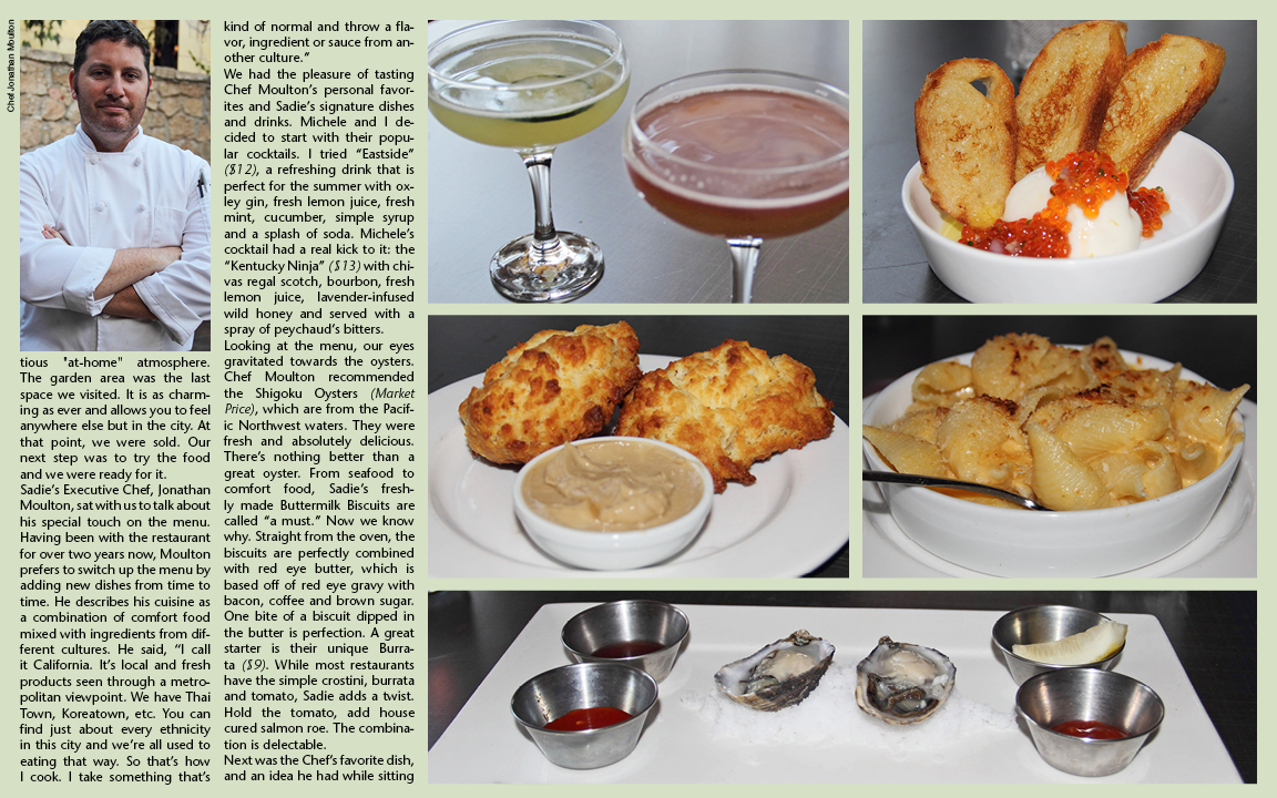 Sadie’s Executive Chef, Jonathan Moulton, sat with us to talk about his special touch on the menu. Having been with the restaurant for over two years now, Moulton prefers to switch up the menu by adding new dishes from time to time. He describes his cuisine as a combination of comfort food mixed with ingredients from different cultures. He said, “I call it California. It’s local and fresh products seen through a metropolitan viewpoint. We have Thai Town, Koreatown, etc. You can find just about every ethnicity in this city and we’re all used to eating that way. So that’s how I cook. I take something that’s kind of normal and throw a flavor, ingredient or sauce from another culture.”