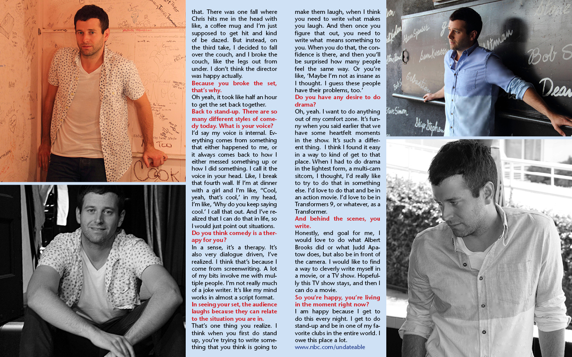 Brian: Downtown LA has changed so much since I first came out here 16 years ago. The only people that ventured east of Hill Street were the homeless, and most of those buildings were abandoned and empty. Almost every residential building we filmed in for “About Last Night” were abandoned. They were just empty shells. And now there are all these beautiful lofts and all these beautiful spaces.
