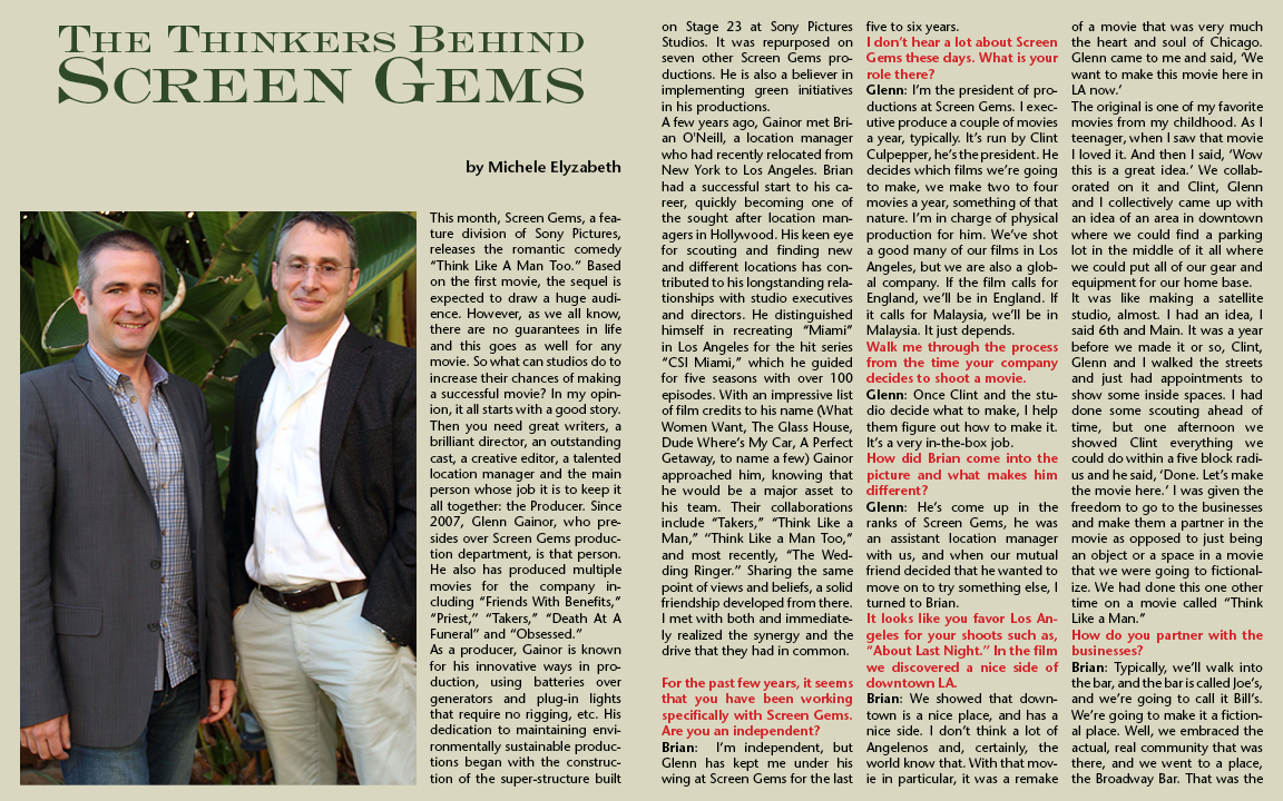 A few years ago, Gainor met Brian O'Neill, a location manager who had recently relocated from New York to Los Angeles. Brian had a successful start to his career, quickly becoming one of the sought after location managers in Hollywood. His keen eye for scouting and finding new and different locations has contributed to his longstanding relationships with studio executives and directors. He distinguished himself in recreating “Miami” in Los Angeles for the hit series “CSI Miami,” which he guided for five seasons with over 100 episodes. With an impressive list of film credits to his name (What Women Want, The Glass House, Dude Where’s My Car, A Perfect Getaway, to name a few) Gainor approached him, knowing that he would be a major asset to his team. Their collaborations include “Takers,” “Think Like a Man,” “Think Like a Man Too,” and most recently, “The Wedding Ringer.” Sharing the same point of views and beliefs, a solid friendship developed from there. I met with both and immediately realized the synergy and the drive that they had in common.