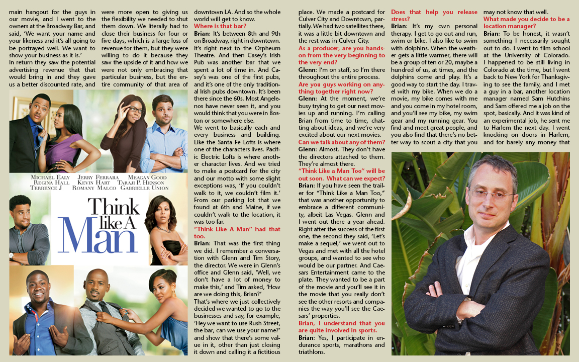 Brian: If you have seen the trailer for “Think Like a Man Too,” that was another opportunity to embrace a different community — albeit Las Vegas. Glenn and I went out there a year ahead. Right after the success of the first one, the second they said, ‘Let’s make a sequel,’ we went out to Vegas and met with all the hotel groups, and wanted to see who would be our partner. And Caesars Entertainment came to the plate. They wanted to be a part of the movie and you’ll see it in the movie that you really don’t see the other resorts and companies the way you’ll see the Caesars’ properties.