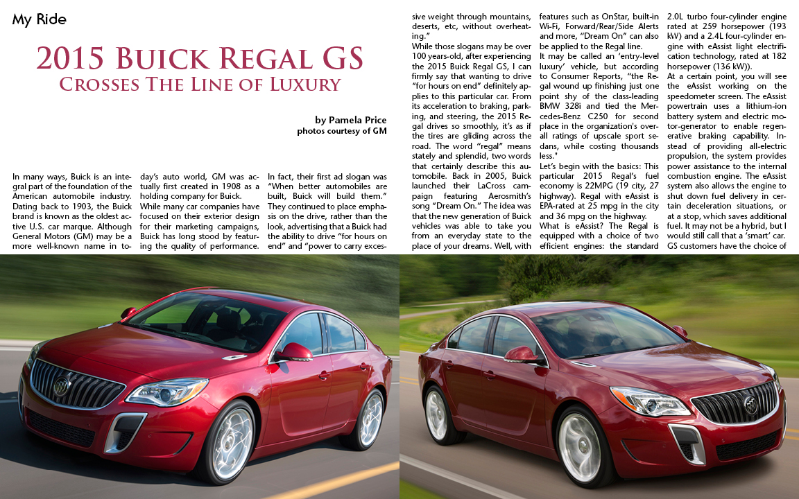 While those slogans may be over 100 years-old, after experiencing the 2015 Buick Regal GS, I can firmly say that wanting to drive “for hours on end” definitely applies to this particular car. From its acceleration to braking, parking, and steering, the 2015 Regal drives so smoothly, it’s as if the tires are gliding across the road. The word “regal” means stately and splendid, two words that certainly describe this automobile. Back in 2005, Buick launched their LaCross campaign featuring Aerosmith’s song “Dream On.” The idea was that the new generation of Buick vehicles was able to take you from an everyday state to the place of your dreams. Well, with features such as OnStar, built-in Wi-Fi, Forward/Rear/Side Alerts and more, “Dream On” can also be applied to the Regal line.