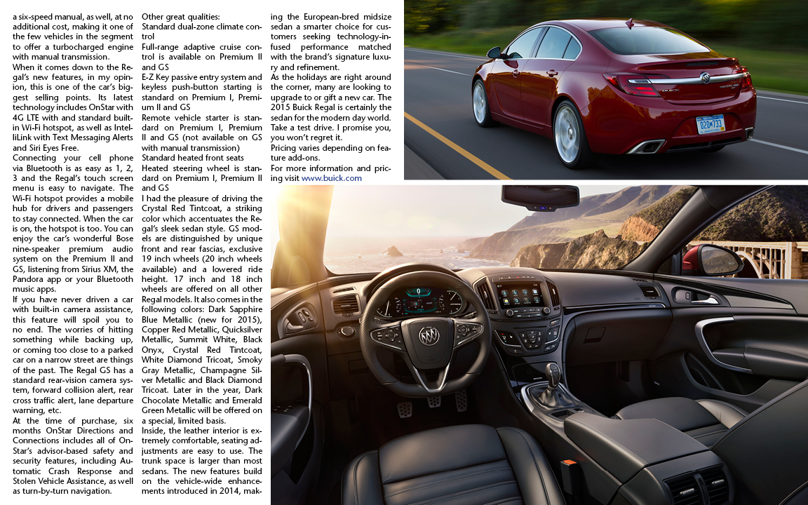 As the holidays are right around the corner, many are looking to upgrade to or gift a new car. The 2015 Buick Regal is certainly the sedan for the modern day world. Take a test drive. I promise you, you won’t regret it.