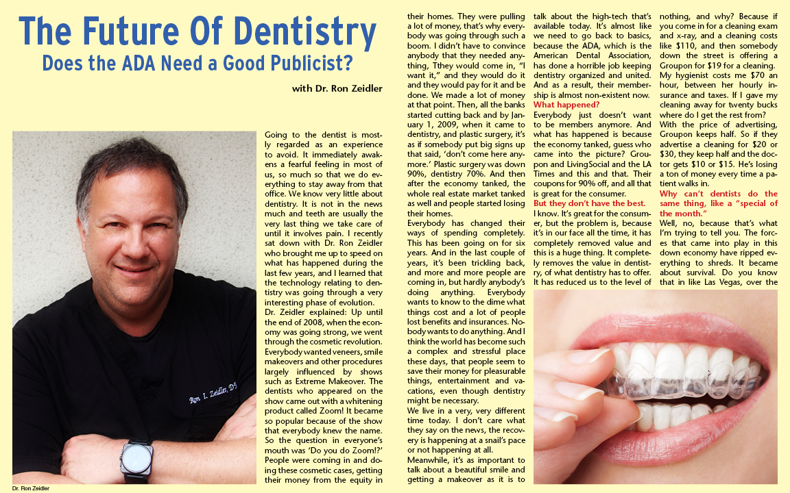Going to the dentist is mostly regarded as an experience to avoid. It immediately awakens a fearful feeling in most of us, so much so that we do everything to stay away from that office. We know very little about dentistry. It is not in the news much and teeth are usually the very last thing we take care of until it involves pain. I recently sat down with Dr. Ron Zeidler who brought me up to speed on what has happened during the last few years, and I learned that the technology relating to dentistry was going through a very interesting phase of evolution.