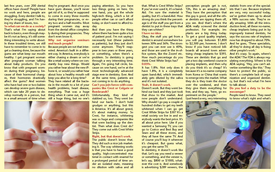 Meanwhile, it’s as important to talk about a beautiful smile and getting a makeover as it is to talk about the high-tech that’s available today. It’s almost like we need to go back to basics, because the ADA — which is the American Dental Association — has done a horrible job keeping dentistry organized and united. And as a result, their membership is almost non-existent now.