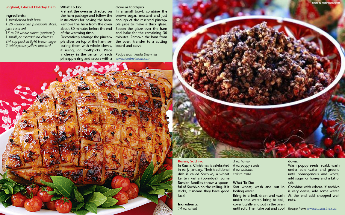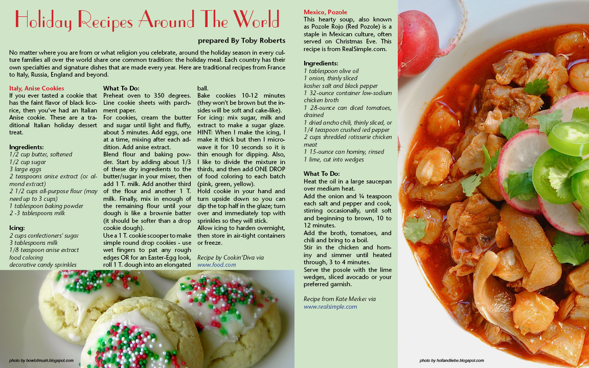 Holiday Recipes Around The World prepared By Toby Roberts No matter where you are from or what religion you celebrate, around the holiday season in every culture families all over the world share one common tradition: the holiday meal. Each country has their own specialties and signature dishes that are made every year. Here are traditional recipes from France to Italy, Russia, England and beyond. Italy, Anise Cookies If you ever tasted a cookie that has the faint flavor of black licorice, then you’ve had an Italian Anise cookie. These are a traditional Italian holiday dessert treat. Ingredients ICING What To Do: Preheat oven to 350 degrees. Line cookie sheets with parchment paper. For cookies, cream the butter and sugar until light and fluffy, about 5 minutes. Add eggs, one at a time, mixing after each addition. Add anise extract. Blend flour and baking powder. Start by adding about 1/3 of these dry ingredients to the butter/sugar in your mixer, then add 1 T. milk. Add another third of the flour and another 1 T. milk. Finally, mix in enough of the remaining flour until your dough is like a brownie batter (it should be softer than a drop cookie dough). Use a 1 T. cookie scooper to make simple round drop cookies - use wet fingers to pat any rough edges OR for an Easter-Egg look, roll 1 T. dough into an elongated ball. Bake cookies 10-12 minutes (they won't be brown but the insides will be soft and cake-like). For icing: mix sugar, milk and extract to make a sugar glaze. HINT: When I make the icing, I make it thick but then I microwave it for 10 seconds so it is thin enough for dipping. Also, I like to divide the mixture in thirds, and then add ONE DROP of food coloring to each batch (pink, green, yellow). Hold cookie in your hand and turn upside down so you can dip the top half in the glaze; turn over and immediately top with sprinkles so they will stick. Allow icing to harden overnight; then store in air-tight containers or freeze. Recipe by Cookin’Diva via www.food.com Mexico, Pozole This hearty soup, also known as Pozole Rojo (Red Pozole) is a staple in Mexican culture, often served on Christmas Eve. This recipe is from RealSimple.com. Ingredients: What To Do: Heat the oil in a large saucepan over medium heat. Add the onion and ¼ teaspoon each salt and pepper and cook, stirring occasionally, until soft and beginning to brown, 10 to 12 minutes. Add the broth, tomatoes, and chili and bring to a boil. Stir in the chicken and hominy and simmer until heated through, 3 to 4 minutes. Serve the posole with the lime wedges, sliced avocado or your preferred garnish. England, Glazed Holiday Ham Ingredients: What To Do: Preheat the oven as directed on the ham package and follow the instructions for baking the ham. Remove the ham from the oven about 30 minutes before the end of the warming time. Decoratively arrange the pineapple slices on top of the ham, securing them with whole cloves, if using, or toothpicks. Place a cherry in the center of each pineapple ring and secure with a clove or toothpick. In a small bowl, combine the brown sugar, mustard and just enough of the reserved pineapple juice to make a thick glaze. Spoon the glaze over the ham and bake for the remaining 30 minutes. Remove the ham from the oven, transfer to a cutting board and carve. Recipe from Paula Deen via www.foodnetwork.com Russia, Sochivo In Russia, Christmas is celebrated in early January. Their traditional dish is called Sochivo, a wheat Lenten kasha (porridge). Some Russian families throw a spoonful of Sochivo on the ceiling. If it sticks, it means they have good luck! Ingredients: What To Do: Bring to a boil, drain and wash under cold water, bring to boil, cover tightly and put in the oven until soft. Then take out and cool down. Wash poppy seeds, scald, wash under cold water and ground until homogenous and white, add sugar or honey and a bit of salt. Combine with wheat. If sochivo is very dense, add some water. At the end add chopped walnuts. Recipe from http://www.ruscuisine.com China, Almond Cookies Only a small population of Chinese celebrate Christmas, but they still have holiday recipes! This one is very popular for their New Year. Almond Cookies are a popular dessert. This recipe will make about 4 dozen. Ingredients What To Do: