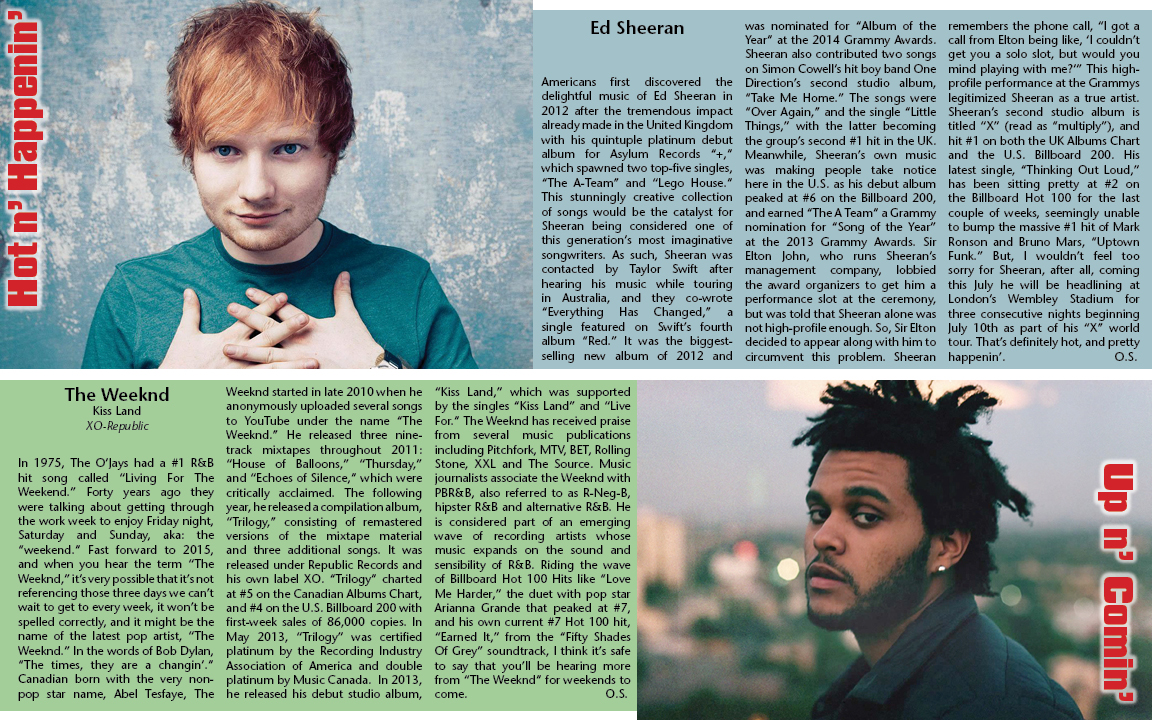 Americans first discovered the delightful music of Ed Sheeran in 2012 after the tremendous impact already made in the United Kingdom with his quintuple platinum debut album for Asylum Records “+,” which spawned two top-five singles, “The A-Team” and “Lego House.” This stunningly creative collection of songs would be the catalyst for Sheeran being considered one of this generation’s most imaginative songwriters. As such, Sheeran was contacted by Taylor Swift after hearing his music while touring in Australia, and they co-wrote “Everything Has Changed,” a single featured on Swift’s fourth album “Red.” It was the biggest-selling new album of 2012 and was nominated for “Album of the Year” at the 2014 Grammy Awards. Sheeran also contributed two songs on Simon Cowell’s hit boy band One Direction’s second studio album, “Take Me Home.” The songs were “Over Again,” and the single “Little Things,” with the latter becoming the group’s second #1 hit in the UK. Meanwhile, Sheeran’s own music was making people take notice here in the U.S. as his debut album peaked at #6 on the Billboard 200, and earned “The A Team” a Grammy nomination for “Song of the Year” at the 2013 Grammy Awards. Sir Elton John, who runs Sheeran’s management company, lobbied the award organizers to get him a performance slot at the ceremony, but was told that Sheeran alone was not high-profile enough. So, Sir Elton decided to appear along with him to circumvent this problem. Sheeran remembers the phone call, “I got a call from Elton being like, ‘I couldn’t get you a solo slot, but would you mind playing with me?’” This high-profile performance at the Grammys legitimized Sheeran as a true artist. Sheeran’s second studio album is titled “X” (read as “multiply”), and hit #1 on both the UK Albums Chart and the U.S. Billboard 200. His latest single, “Thinking Out Loud,” has been sitting pretty at #2 on the Billboard Hot 100 for the last couple of weeks, seemingly unable to bump the massive #1 hit of Mark Ronson and Bruno Mars, “Uptown Funk.” But, I wouldn’t feel too sorry for Sheeran, after all, coming this July he will be headlining at London’s Wembley Stadium for three consecutive nights beginning July 10th as part of his “X” world tour. In 1975, The O’Jays had a #1 R&B hit song called “Living For The Weekend.” Forty years ago they were talking about getting through the work week to enjoy Friday night, Saturday and Sunday, aka: the “weekend.” Fast forward to 2015, and when you hear the term “The Weeknd,” it’s very possible that it’s not referencing those three days we can’t wait to get to every week, it won’t be spelled correctly, and it might be the name of the latest pop artist, “The Weeknd.” In the words of Bob Dylan, “The times, they are a changin’.” Canadian born with the very non-pop star name, Abel Tesfaye, The Weeknd started in late 2010 when he anonymously uploaded several songs to YouTube under the name “The Weeknd.” He released three nine-track mixtapes throughout 2011: “House of Balloons,” “Thursday,” and “Echoes of Silence,” which were critically acclaimed. The following year, he released a compilation album, “Trilogy,” consisting of remastered versions of the mixtape material and three additional songs. It was released under Republic Records and his own label XO. “Trilogy” charted at #5 on the Canadian Albums Chart, and #4 on the U.S. Billboard 200 with first-week sales of 86,000 copies. In May 2013, “Trilogy” was certified platinum by the Recording Industry Association of America and double platinum by Music Canada. In 2013, he released his debut studio album, “Kiss Land,” which was supported by the singles “Kiss Land” and “Live For.” The Weeknd has received praise from several music publications including Pitchfork, MTV, BET, Rolling Stone, XXL and The Source. Music journalists associate the Weeknd with PBR&B, also referred to as R-Neg-B, hipster R&B and alternative R&B. He is considered part of an emerging wave of recording artists whose music expands on the sound and sensibility of R&B. Riding the wave of Billboard Hot 100 Hits like “Love Me Harder,” the duet with pop star Arianna Grande that peaked at #7, and his own current #7 Hot 100 hit, “Earned It,” from the “Fifty Shades Of Grey” soundtrack, I think it’s safe to say that you’ll be hearing more from “The Weeknd” in weekends to come. That’s definitely hot, and pretty happenin’. |