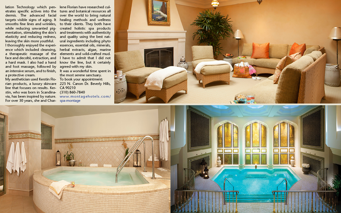 Located on the third floor of the Montage Beverly Hills, Spa Montage is the largest spa in California, boasting 20,000 square feet devoted to pure wellness. As you exit the elevator, you enter through the Spa Boutique which offers luxurious beauty products: niche organic products, unique gifts, as well as workout gear and casual wear; making it impossible not to find something to buy. As I made my way to the reception, I was greeted by a hostess who escorted me to my technician and gave me a tour of the facility which included Turkish steam rooms, dry redwood saunas, whirlpools, restful lounges, and a mineralized wellness pool centered in the atrium. The architecture is inspired by the traditional Spanish Colonial Revival style which is prevalent in Beverly Hills. It is clear that whether you are seeking relaxation or treatment, Spa Montage offers the best of both worlds. The menu of services is quite extensive, from lavish facials, body therapies and massage therapies to nail therapies; you can spend half a day or the full day being pampered.
