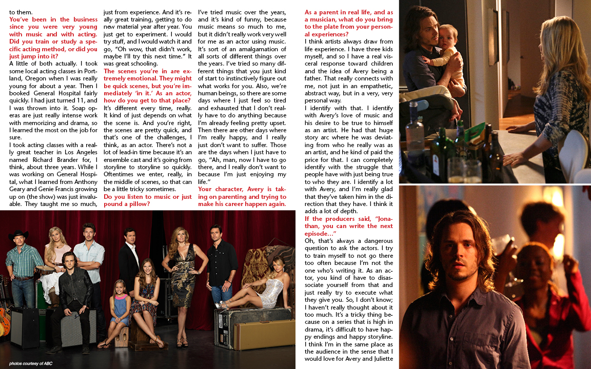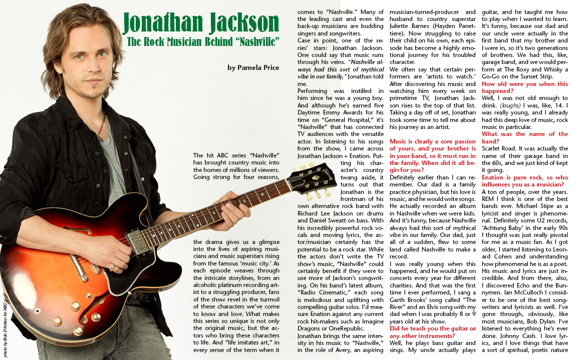 by Pamela Price The hit ABC series “Nashville” has brought country music into the homes of millions of viewers. Going strong for four seasons, the drama gives us a glimpse into the lives of aspiring musicians and music superstars rising from the famous ‘music city.’ As each episode weaves through the intricate story lines, from an alcoholic platinum recording artist to a struggling producer, fans of the show revel in the turmoil of these characters we’ve come to know and love. What makes this series so unique is not only the original music, but the actors who bring these characters to life. And “life imitates art,” in every sense of the term when it comes to “Nashville.” Many of the leading cast and even the back-up musicians are budding singers and songwriters. Case in point, one of the series’ stars: Jonathan Jackson. One could say that music runs through his veins. “Nashville always had this sort of mythical vibe in our family,” Jonathan told me. Performing was instilled in him since he was a young boy. And although he’s earned five Daytime Emmy Awards for his time on “General Hospital,” it’s “Nashville” that has connected TV audiences with the versatile actor. In listening to his songs from the show, I came across Jonathan Jackson + Enation. Putting his character’s country twang aside, it turns out that Jonathan is the frontman of his own alternative rock band with Richard Lee Jackson on drums and Daniel Sweatt on bass. With his incredibly powerful rock vocals and moving lyrics, the actor/musician certainly has the potential to be a rock star. While the actors don’t write the TV show’s music, “Nashville” could certainly benefit if they were to use more of Jackson’s songwriting. On his band’s latest album, “Radio Cinematic,” each song is melodious and uplifting with compelling guitar solos. I’d measure Enation against any current rock hit-makers such as Imagine Dragons or OneRepublic. Jonathan brings the same intensity in his music to “Nashville,” in the role of Avery, an aspiring musician-turned-producer and husband to country superstar Juliette Barnes (Hayden Panettiere). Now struggling to raise their child on his own, each episode has become a highly emotional journey for his troubled character. We often say that certain performers are ‘artists to watch.’ After discovering his music and watching him every week on primetime TV, Jonathan Jackson rises to the top of that list. Taking a day off of set, Jonathan took some time to tell me about his journey as an artist. Definitely earlier than I can remember. Our dad is a family practice physician, but his love is music, and he would write songs. He actually recorded an album in Nashville when we were kids. And it’s funny, because Nashville always had this sort of mythical vibe in our family. Our dad, just all of a sudden, flew to some land called Nashville to make a record. Did he teach you the guitar or any other instruments? Well, he plays bass guitar and sings. My uncle actually plays guitar, and he taught me how to play when I wanted to learn. It’s funny, because our dad and our uncle were actually in the first band that my brother and I were in, so it’s two generations of brothers. We had this, like, garage band, and we would perform at The Roxy and Whisky a Go-Go on the Sunset Strip. How old were you when this happened? Well, I was not old enough to drink. (laughs). I was, like, 14. I was really young, and I already had this deep love of music — rock music in particular. What was the name of the band? Scarlet Road. It was actually the name of their garage band in the 60s, and we just kind of kept it going. Enation is pure rock, so who influences you as a musician? A ton of people, over the years. REM I think is one of the best bands ever. Michael Stipe as a lyricist and singer is phenomenal. Definitely some U2 records — ‘Achtung Baby’ in the early 90s I thought was just really pivotal for me as a music fan. As I got older, I started listening to Leonard Cohen and understanding how phenomenal he is as a poet. His music and lyrics are just incredible. And from there, also, I discovered Echo and the Bunnymen. Ian McCulloch I consider to be one of the best songwriters and lyricists as well. I’ve gone through, obviously, like most musicians, Bob Dylan. I’ve listened to everything he’s ever done. Johnny Cash. I love lyrics, and I love things that have a sort of spiritual, poetic nature to them. You’ve been in the business since you were very young with music and with acting. Did you train or study a specific acting method, or did you just jump into it? A little of both actually. I took some local acting classes in Portland, Oregon when I was really young for about a year. Then I booked General Hospital fairly quickly. I had just turned 11, and I was thrown into it. Soap operas are just really intense work with memorizing and drama, so I learned the most on the job for sure. I took acting classes with a really great teacher in Los Angeles named Richard Brander for, I think, about three years. While I was working on General Hospital, what I learned from Anthony Geary and Genie Francis growing up on (the show) was just invaluable. They taught me so much, just from experience. And it’s really great training, getting to do new material year after year. You just get to experiment. I would try stuff, and I would watch it and go, “Oh wow, that didn’t work; maybe I’ll try this next time.” It was great schooling. The scenes you’re in are extremely emotional. They might be quick scenes, but you’re immediately ‘in it.’ As an actor, how do you get to that place? It’s different every time, really. It kind of just depends on what the scene is. And you’re right, the scenes are pretty quick, and that’s one of the challenges, I think, as an actor. There’s not a lot of lead-in time because it’s an ensemble cast and it’s going from storyline 